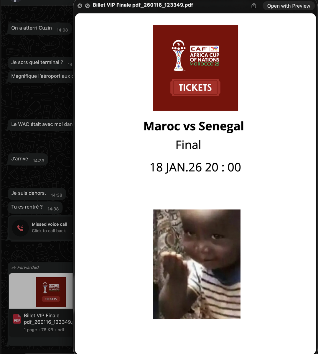 Non, pas d’arnaque. Une connaissance m’a juste envoyé un billet pour la finale soit disant et j’y ai cru. 🙃