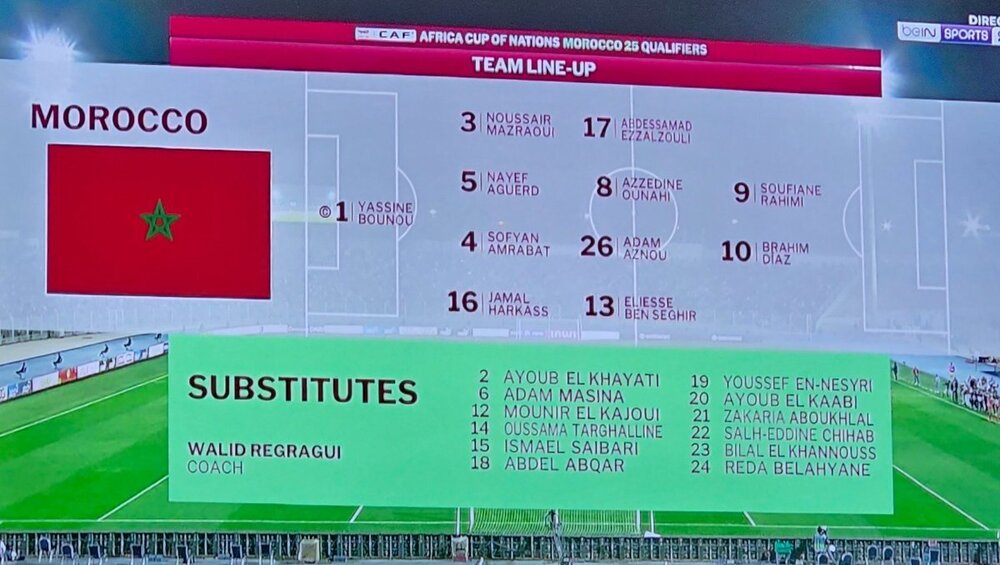 Le positionnement du 11 sur Bein 2 FR Et le commentateur qui commente en disant "Titularisation d'Aznou au milieu"