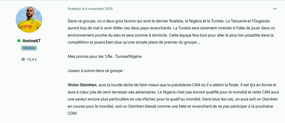 Avant la CAN, j'avais donné mon avis sur chaque groupe... et j'aime bien aller me relire pour voir qu'est ce que je racontais. Et, je constate que tout se déroule comme je l'avais prévu. Donc, nous y voilà avec notre Osimhen revanchard qui va tout faire pour emmener la coupe à la maison… Cependant, il n'est pas le seul à vouloir gagner cette coupe et il a raté l'opportunité en 2024. Le Maroc a le devoir de gagner cette CAN et peu importe qui se présente à lui sera neutralisé… comme prévu nos jeunes insouciants répondent présent… cette génération, je l'avais dit avant la CAN, n'a rien à voir avec notre ancienne génération. Quand tu vois que Neil, Saibari, Khannous et Ezzalzouli sont ceux qui jouent le plus décomplexé, tu comprends vite que cette génération n'a pas peur des défis et que le défi Nigéria est pour elle un challenge plus qu'un fardeau. Ils n'ont pas encore fini de nous surprendre, même un Ingaman qui rentre pour 5 minutes contre le Cameroun te fait un contrôle poitrine sans begayer alors que certains auraient contrôlé du tibia pour la mettre en touche…