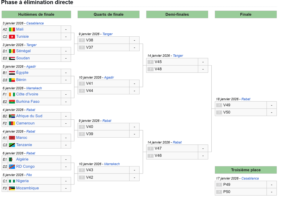 maroc vs qui deja? Easy , Easy Mali vs Tunisie : Je dirais Tunisie a condition qu'ils mettent leur ouilles sur la table sur TOUT le match Sénégal vs Soudan: LOL Egypte vs Bénin : Egypte easy CIV vs Burkina : CIV sans trop trop de soucis , le Burkina va peut etre faire un peu illusion mais ça ne durera pas AFDS vs Cameroun : Je dirais Cameroun mais dans la grosse , grosse difficulté Algérie vs RDC : Le match le plus équilibré et de loin , on verra a ce moment là ce que valent vraiment les DZ. Nigéria vs Mozambique : Nigeria easy