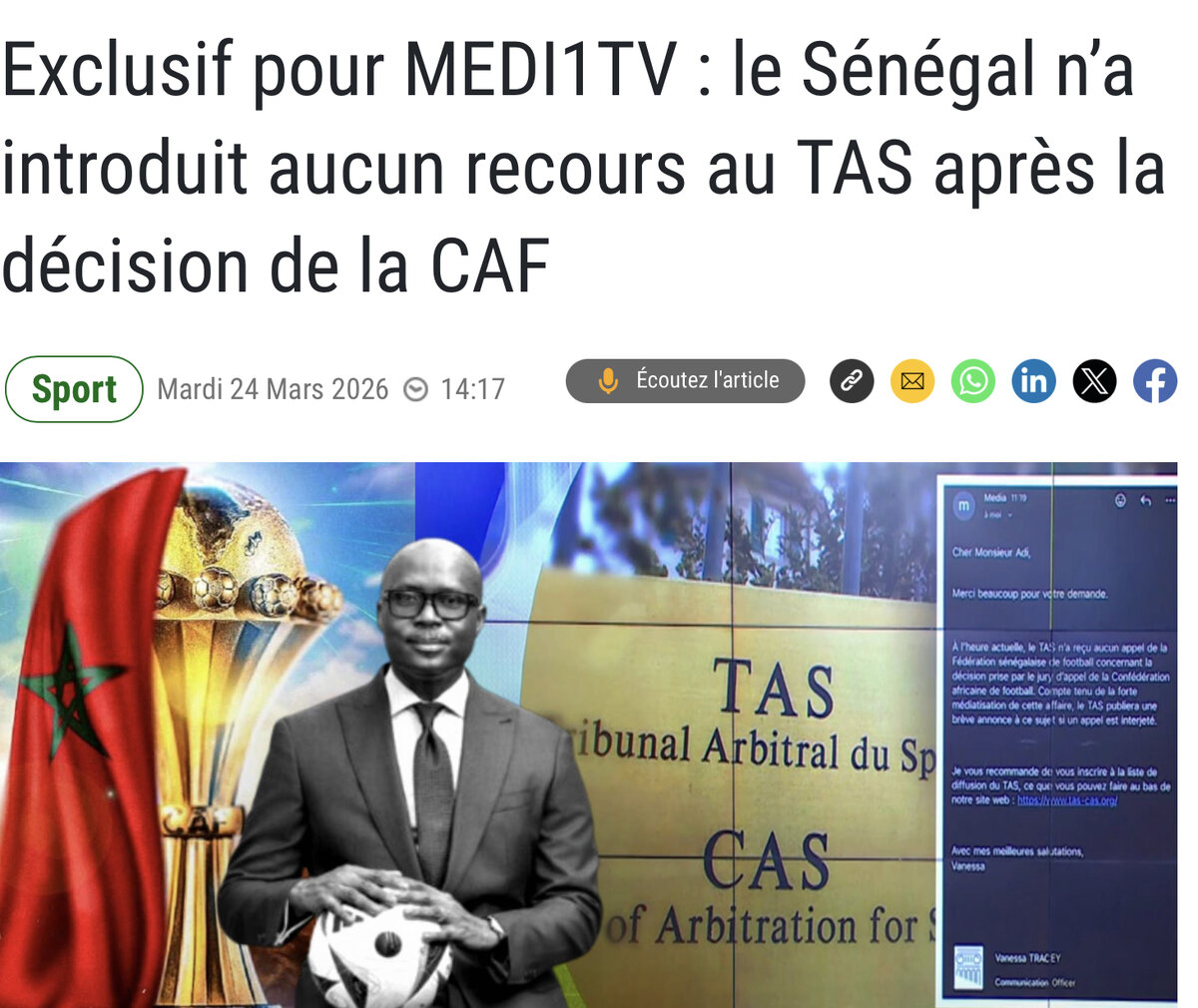 À l'heure actuelle, le TAS n'a reçu aucun appel de la FSF concernant la décision prise par le jury d'appel de la CAF"; Dans une réponse officielle adressée à MEDI1TV, le Tribunal arbitral du sport (TAS) a affirmé n’avoir reçu, à ce jour, aucun recours de la part de la Fédération sénégalaise de football (FSF). Cette absence de saisine concerne la décision rendue par la commission d’appel de la Confédération africaine de football (CAF), relative à la finale de la Coupe d’Afrique des Nations Maroc 2025.- [Amical] Maroc 1 - 1 Équateur