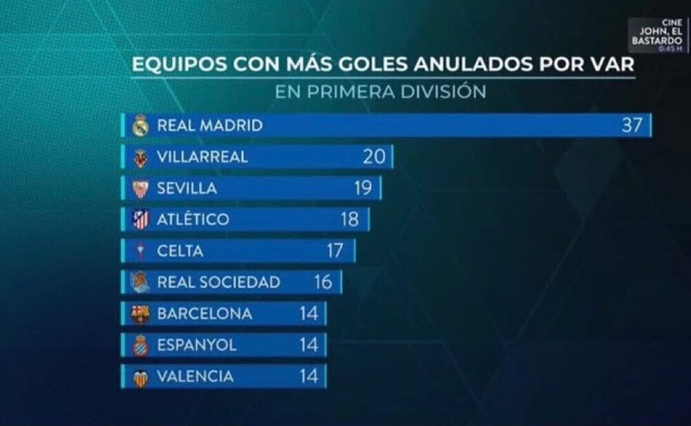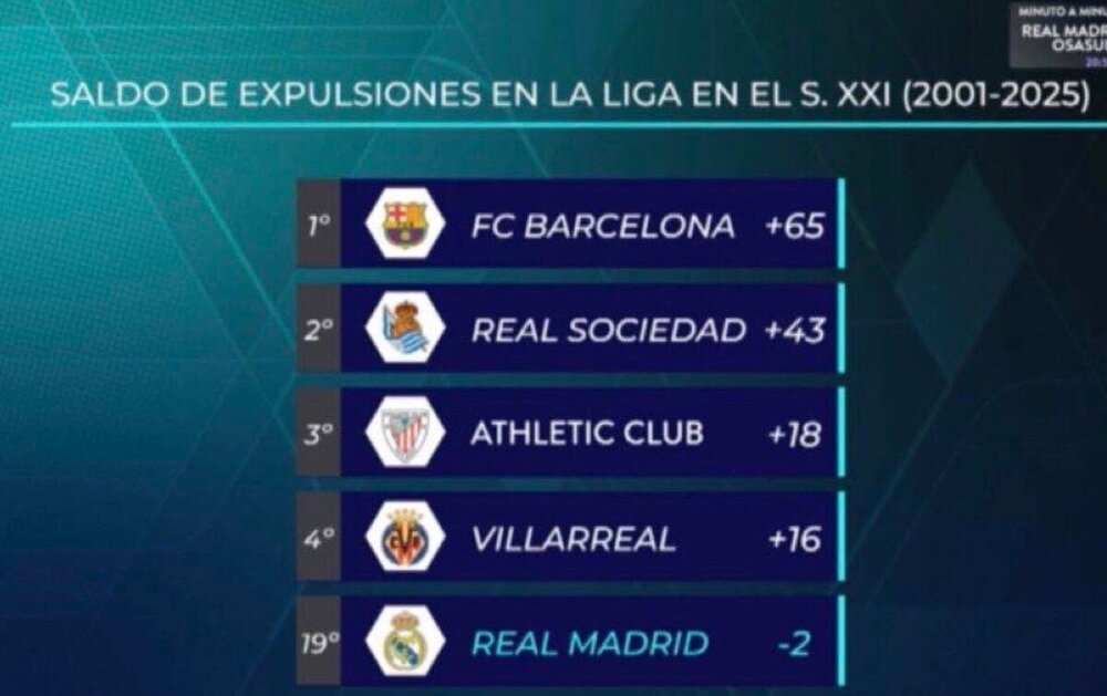 Je n’en ai aucune idée, j’ai essayé de chercher rapidement , j’ai pas réussi, par contre j’ai trouvé ça si ça peut te rassurer. les clubs avec le plus de buts annulés par le var en liga : De 2001 à 2025 Le réal a pris deux cartons rouges de plus que ses adversaires , les adversaires du Barça , de la réal sosciedad ,de l’athletic, et de villaréal en ont pris respectivement 65, 43, 18 et 16 de plus que les clubs cités bref, tout ça pour dire que ce que racontent les haineux français sur leurs plateaux c’est de la c**nerie oui le Real est des fois « avantagé » comme tous les grands clubs mais ça c’est courant dans le foot, souvent certains arbitres ont plus de mal à siffler contre un PSG que contre Lorient par exemple, mais de là à croire à ces sornettes il y’a un monde