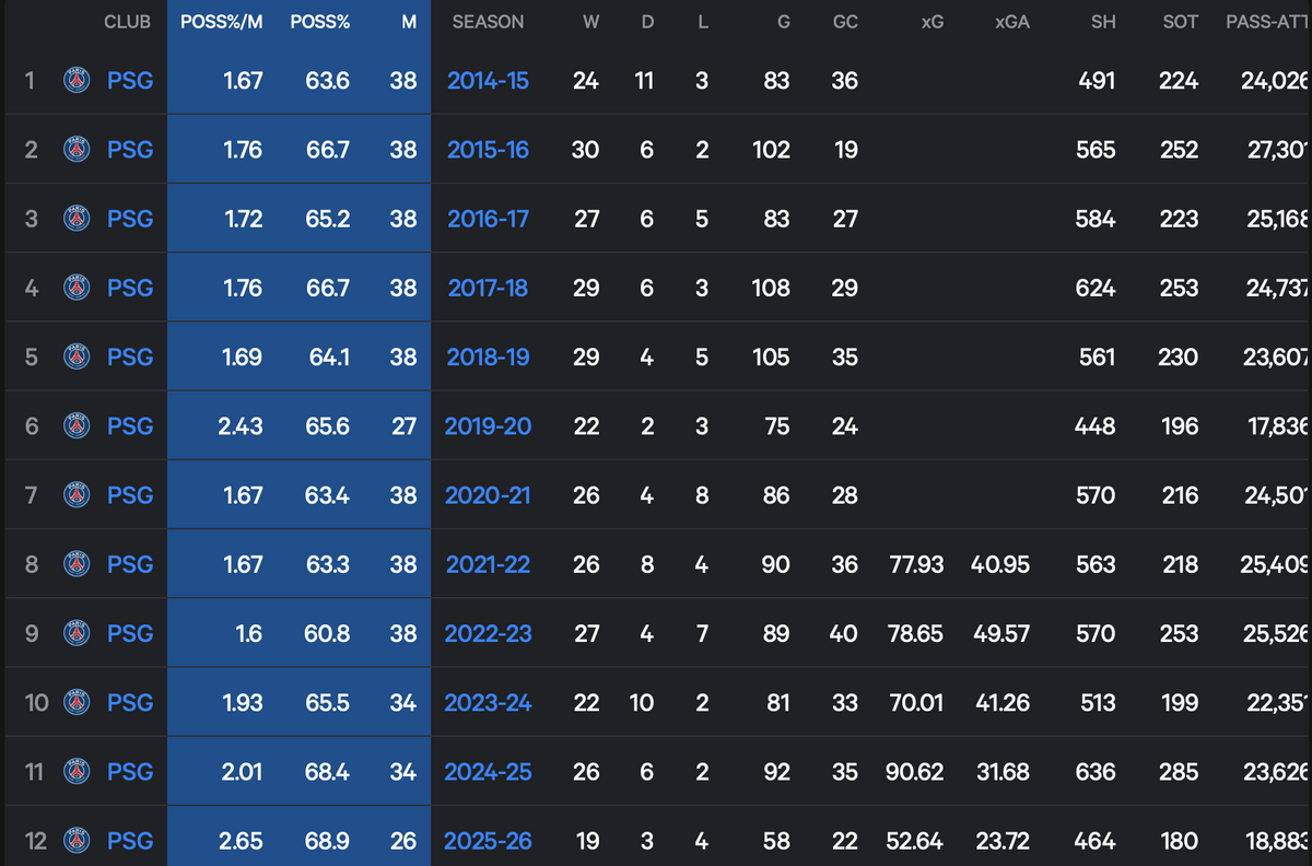 Quote: Le Paris Saint-Germain domine la possession en Ligue 1 2024/2025 avec une moyenne d'environ 68% à 69% par match, se classant premier en France. L'équipe maintient également une forte possession en Ligue des Champions, avoisinant les 67,5% Jouer avec un faux neuf est une c**nerie, on a de bons attaquants il faut les faire jouer, sans philosophie zayda