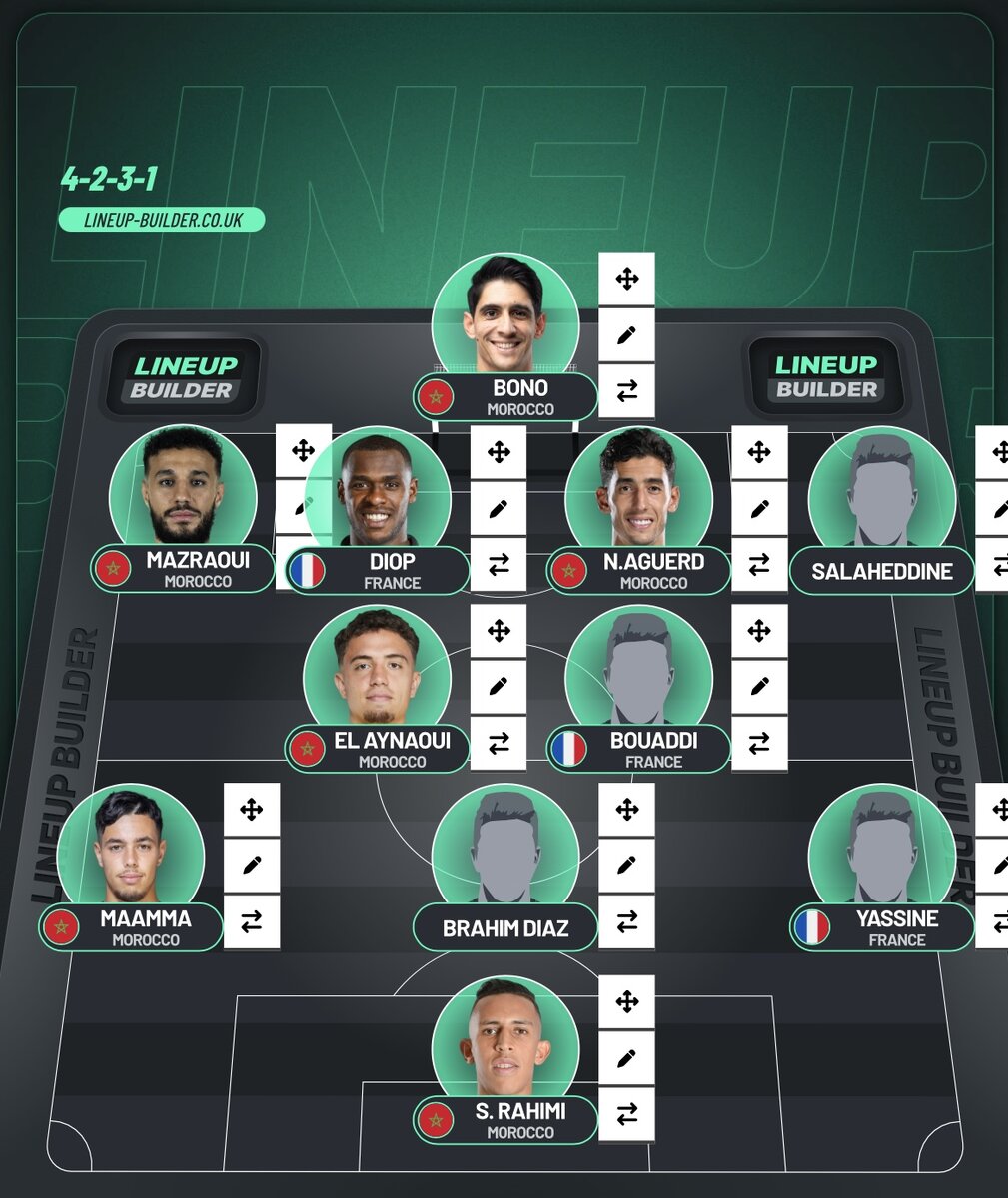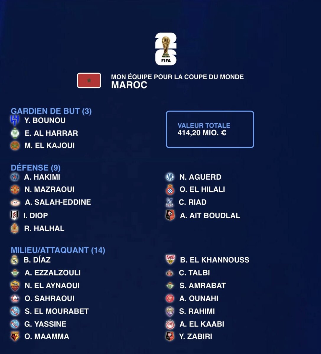 Les amis j’aimerais lancer un concours, chacun poste son groupe de 26 pour la coupe du monde et celui qui l’a juste à 100% reçoit un cadeau. Commencez, n’oubliez pas de jarter Saibari et El Karouani et Targhalline. Les nullards quoi. 🇲🇦🔥 Mes 26 du Maroc – Coupe du Monde 🔥🇲🇦 🧤 Gardiens • Bounou • Munir • El Harrar 🛡️ Défenseurs • Hakimi • El Hilali • Diop • Ait Boudlal • Halhal • Aguerd • Riad • Salaheddine • Mazraoui 🎯 Milieux • Bouaddi • Amrabat • El Mourabet • El Aynaoui • El Khannous • Ounahi ⚡ Ailiers / Offensifs • Gessime • Ezzalzouli • Sahraoui • Maama • Diaz ⚽ Attaquants • Rahimi • El Kaabi • Zabiri