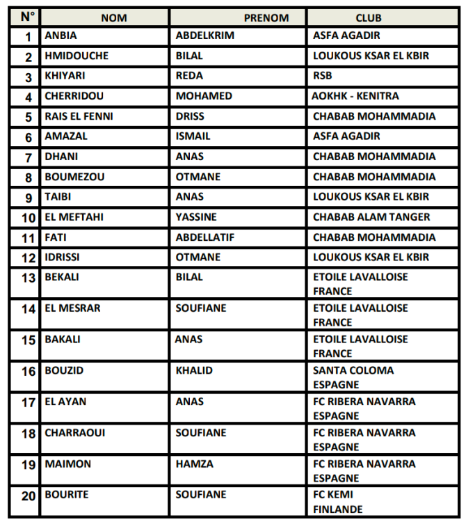 La liste : https://site.frmf.ma/المنتخب-الوطني-لكرة-القدم-لأقل-من-20-سنة/