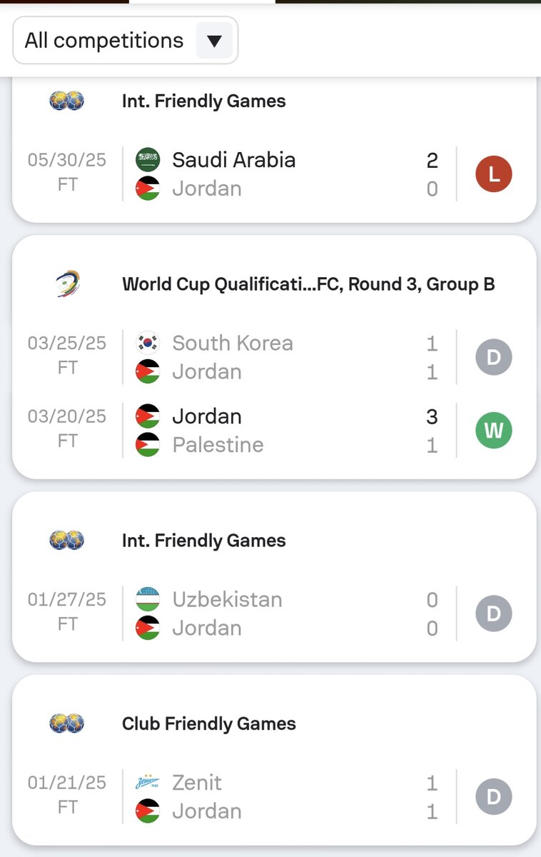 Posté(e) il y a 5 heures5 h Voici tous les matchs de la jordanie en 2025 avant la coupe arabe. On constate qu'il y'a eu pas mal de défaites cette année.