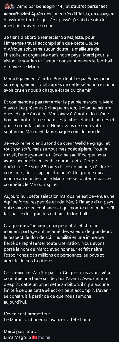 Posté(e) il y a 2 heures2 h il y a 2 minutes, Azrou a dit :Les marocains l’ont à travers la gorge tu pense vraiment qu’ils vont en rester là tu va voir comment ils vont l’insulter lui balancer des bouteilles ou autres dans la face depuis les tribunes qu’il dégage s’il a un minimum de fierté et de respect envers les marocains qu’il a déçuCe mec etait en finale .Tu crois que les sélections du Monde licencié un entraineur finaliste.Du coup tous les pays africains à part le Cirquenal doivent licencier le leur?Perso je pense que c est lui qui doit partir car on a besoin d'un nouveau souffle un nouveau cycle 2026-2030. Je souhaiterais Sektioui coach et Ouahbi adjoint Modifié il y a 2 heures2 h par MAGH7rizi